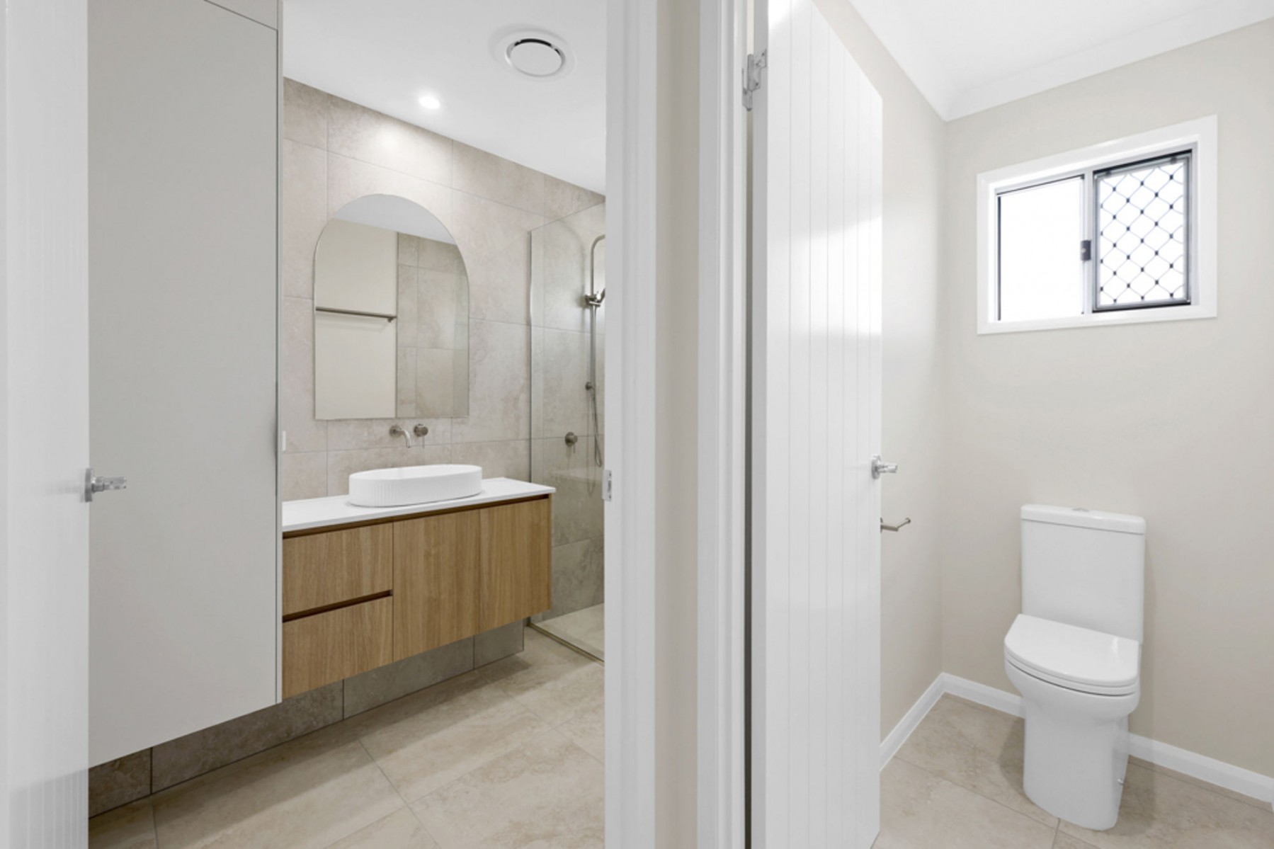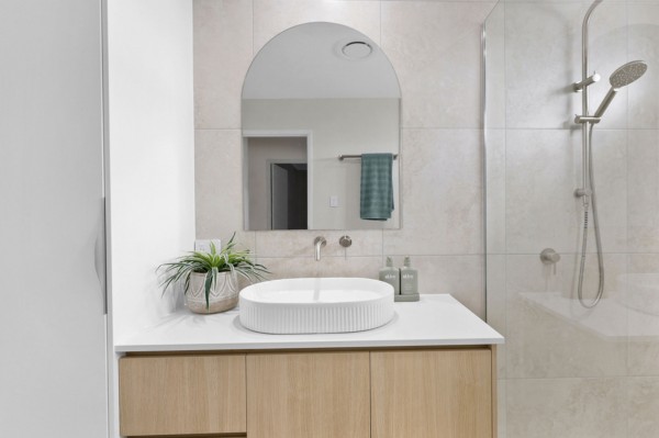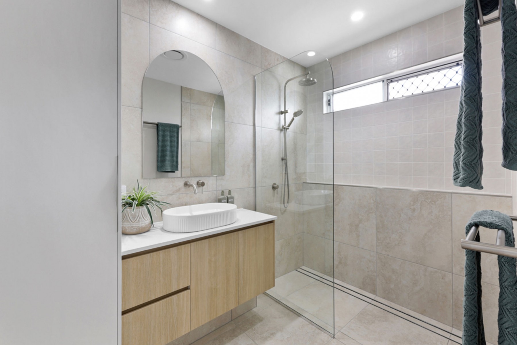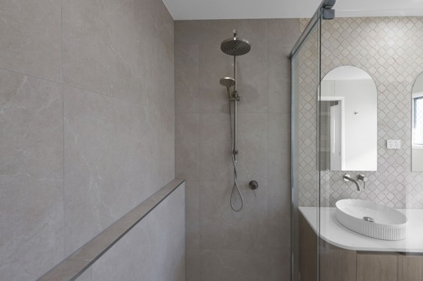 - Family bathroom with walk-in shower, brushed nickel tapware & neutral colour scheme