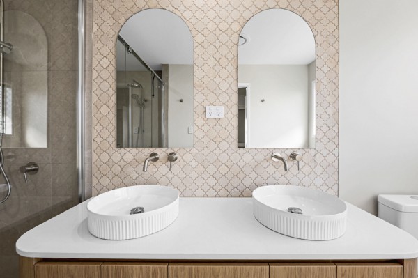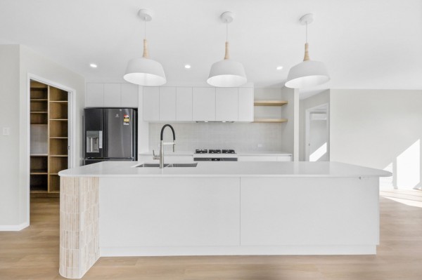 - Stylish kitchen with stone benchtops, island with tiled curved feature, walk-in pantry, gas cooking, dishwasher and plumbed fridge space