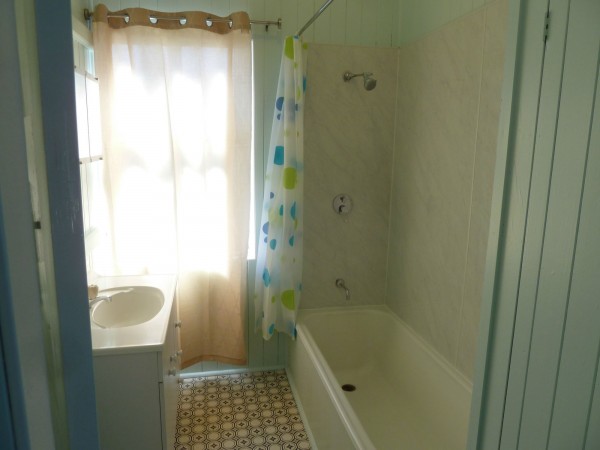 -  Bathroom comes with shower over bath, separate vanity and retro lino flooring from a bye gone era