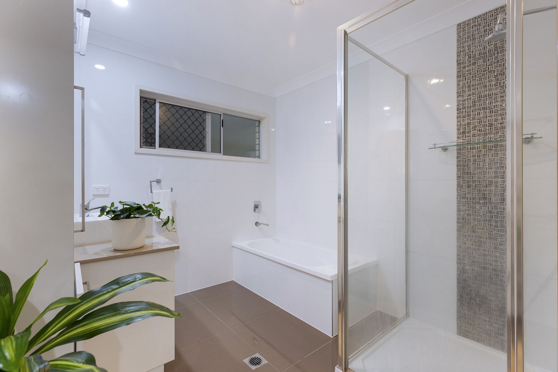 - Stylish main bathroom with floor-to-ceiling tiles, walk-in shower, bath and built-in linen and laundry storage