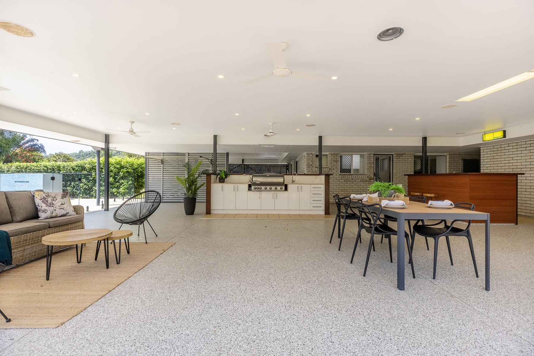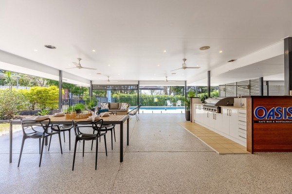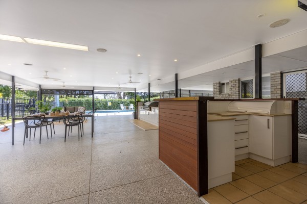 - Huge undercover entertaining area with built-in bar, built-in BBQ and ceiling fans