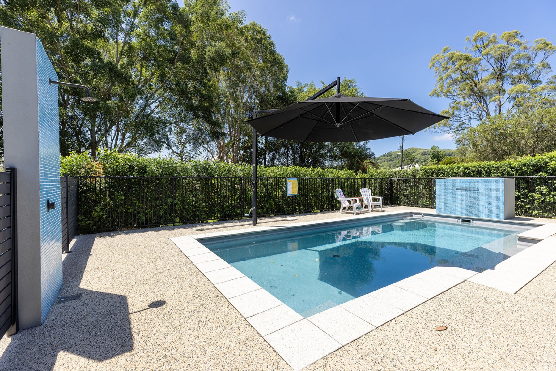 - Saltwater in-ground pool with waterfall feature, outdoor shower and cantilever umbrella for shade