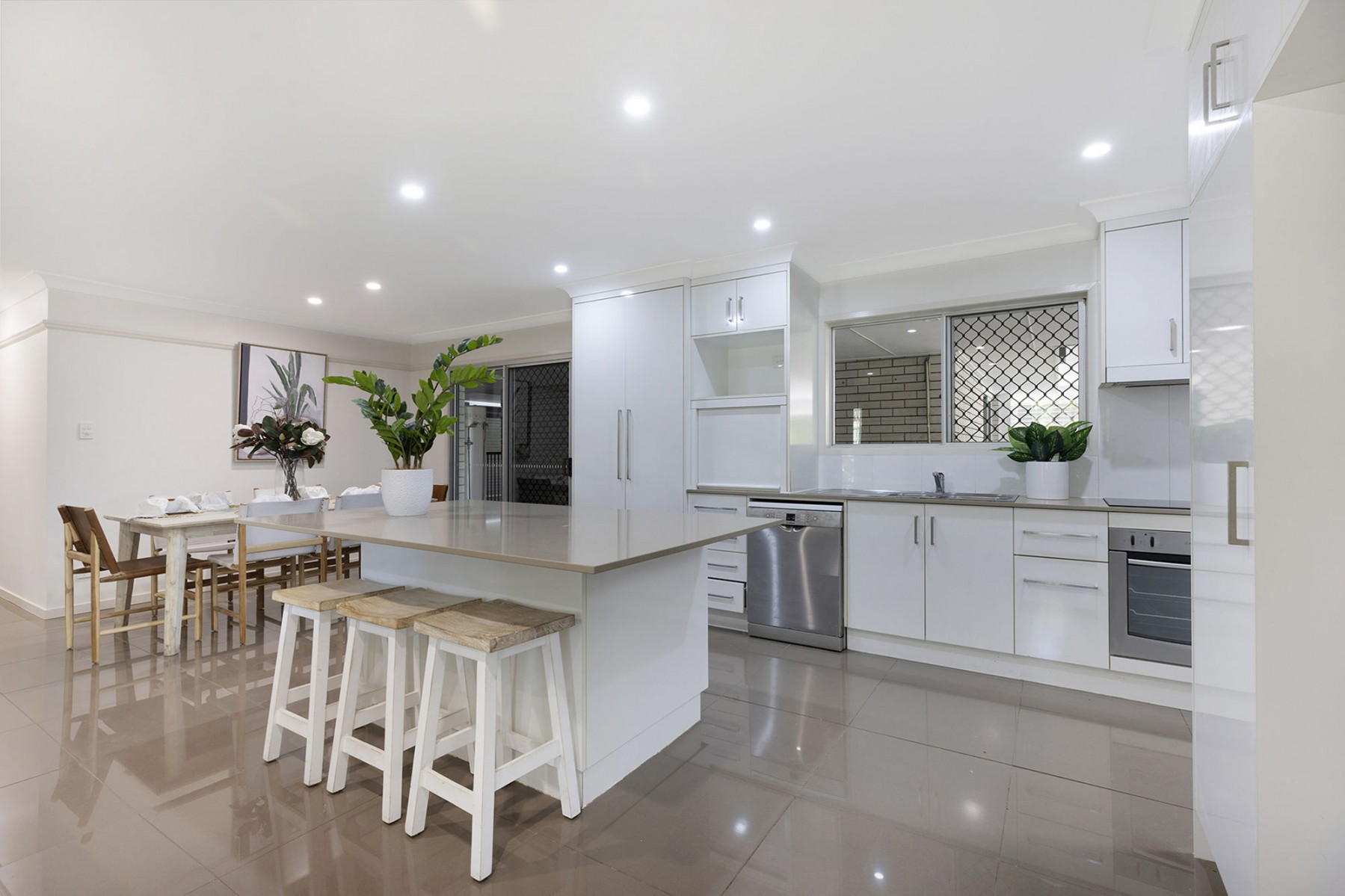 - Contemporary kitchen with stone benchtops, island bench with ample storage, wall oven, electric cooktop, dishwasher and double pantry with pull-out storage