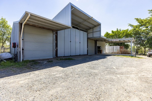 - Massive high-clearance 4 bay shed (15m x 9m) featuring a self-contained unit with kitchenette, bathroom/laundry, office/multipurpose space and mezzanine storage