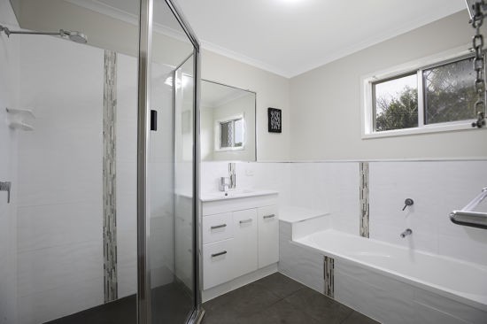 - Bathroom contains a stylish and modern vanity, shower and toilet