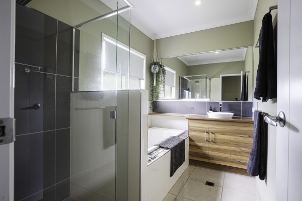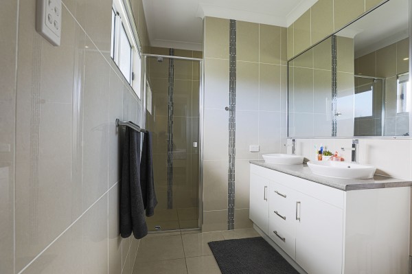 - Main bathroom with floor to ceiling tiles, large vanity and separate shower and bath