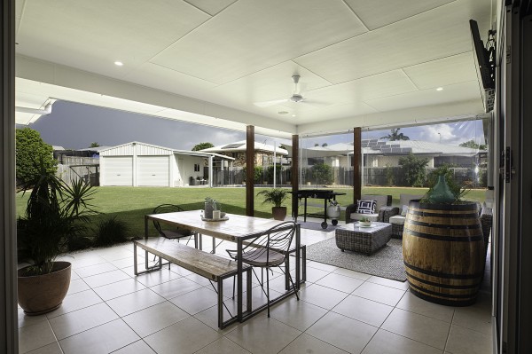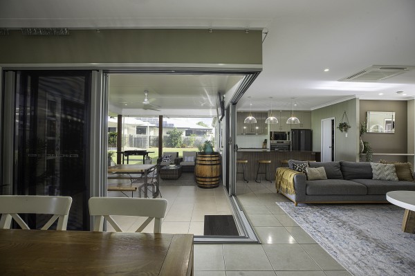 - Open plan dining and living area with bi fold screens that open onto the patio