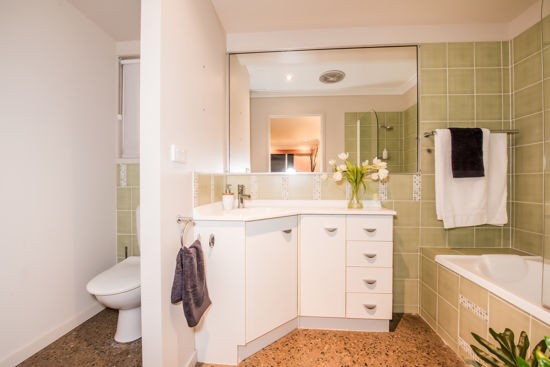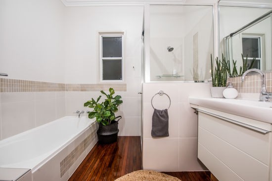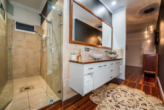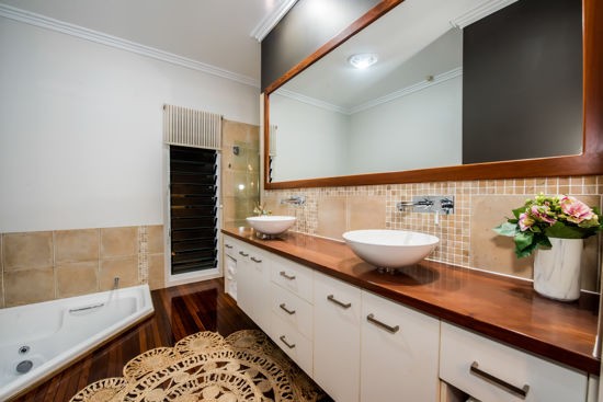 • The three bedrooms all have split-system air-conditioners, fans and built-in wardrobes. The beautiful main bedroom has a walk-in wardrobe and a sensational bathroom with plunge spa bath and double shower