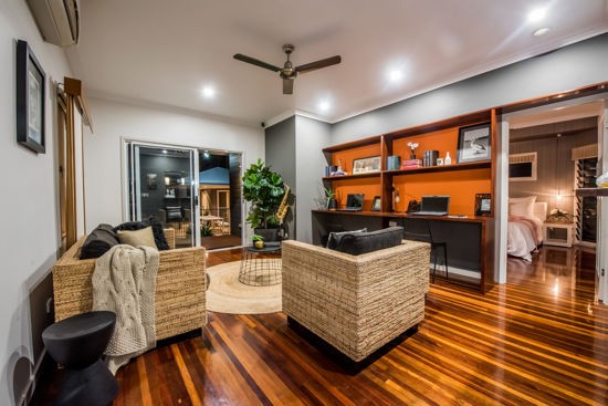 • There is a second living area, which includes a built-in study space, that leads to the rear deck over-looking the pool