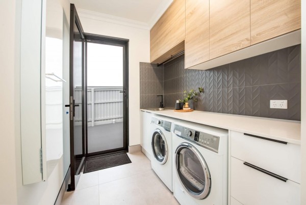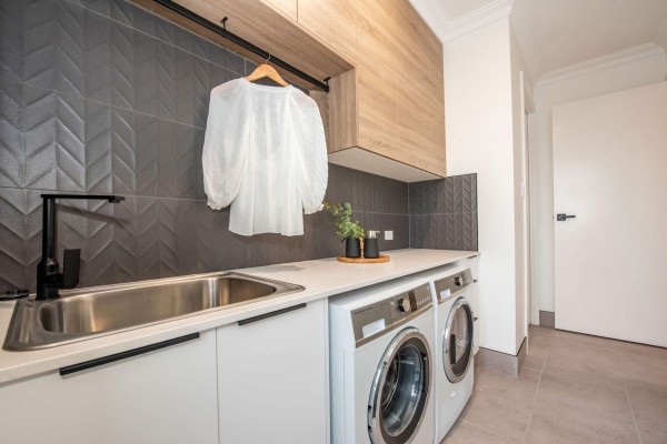 - Large laundry featuring a walk-in linen cupboard with power, perfect for recharging cleaning appliances