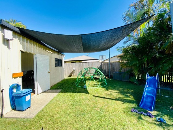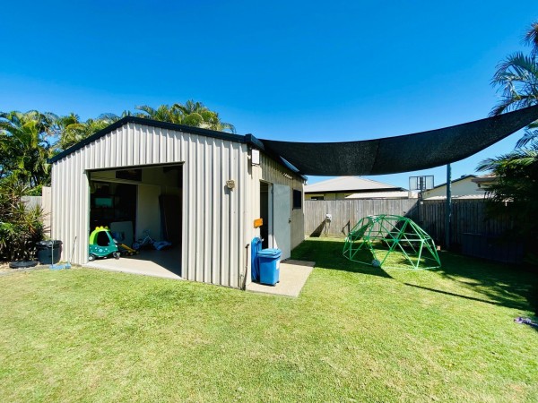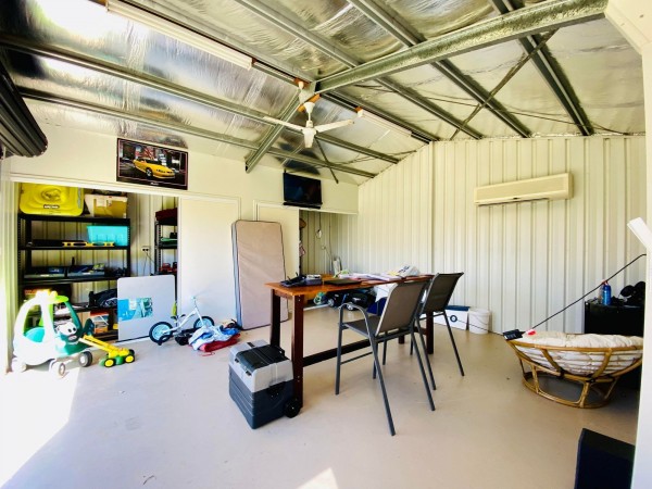 - Great side access to the insulated, fully lined, air conditioned shed with 15amp power, water and built in storage with adjacent shade sail PLUS a large garden shed