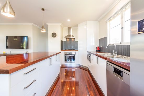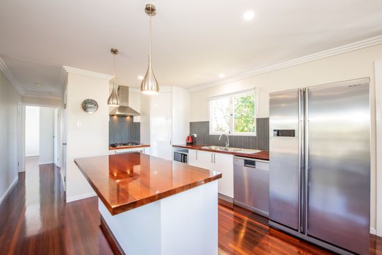 - A renovated kitchen with gas stove, dishwasher and island bench in keeping with the polished timber floorboards and timber deck