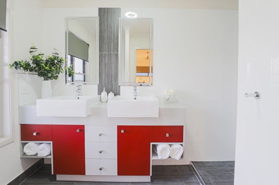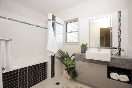 - The stylish kitchen is at the centre of the home and contains a host of modern appliances and a breakfast bar with stone benchtops