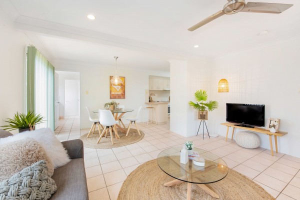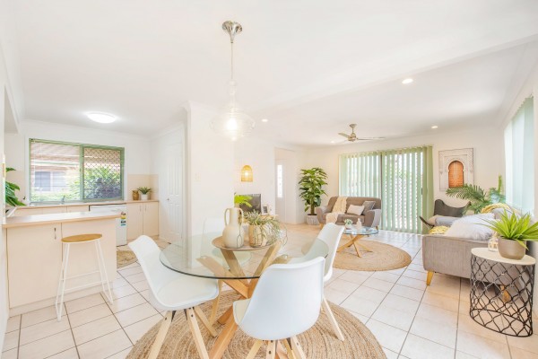 - A tiled, spacious, open-plan family room with lounge and dining areas that flow out through sliding doors to the outdoor area