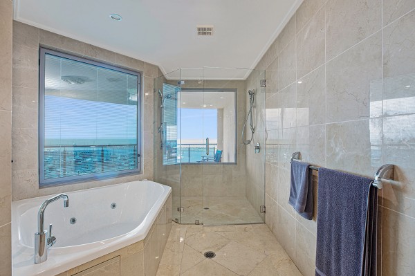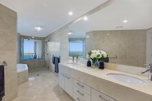 - Stunning main bathroom with floor to ceiling marble tiles, plus double vanity, seamless shower and spa bath
