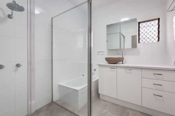 - Timeless renovated family bathroom boasts a large shower with rainfall shower head, bath for the kids, vanity with a gorgeous feature stone sink and separate toilet.