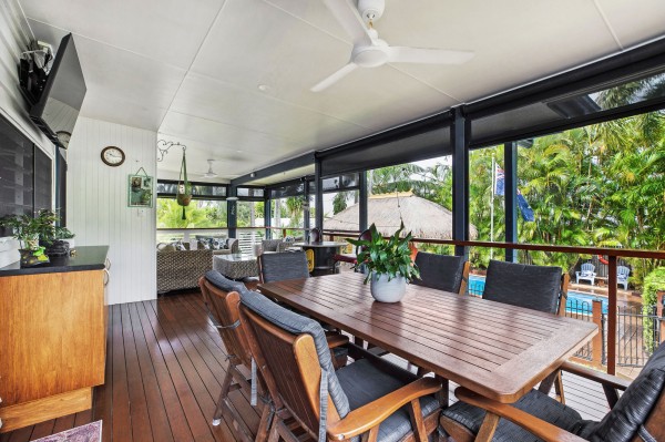 - Expansive rear verandah with patio blinds overlooking the pool.