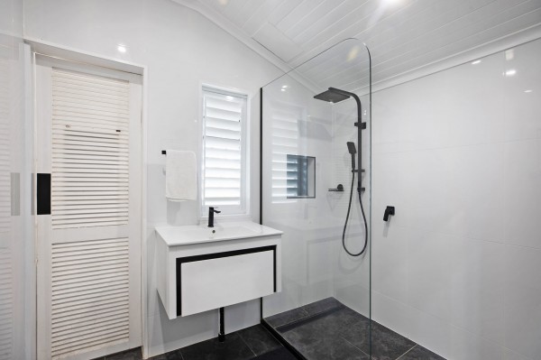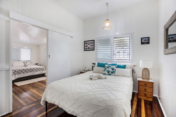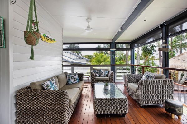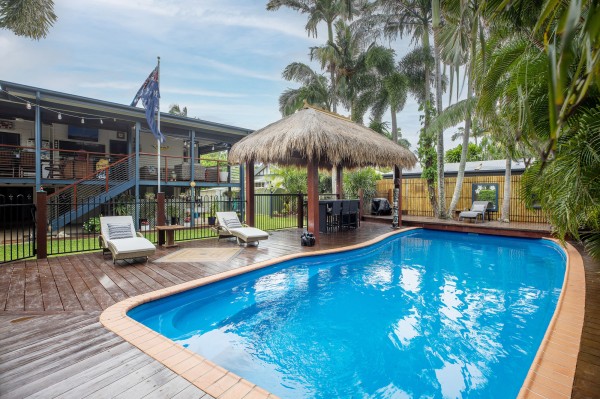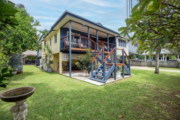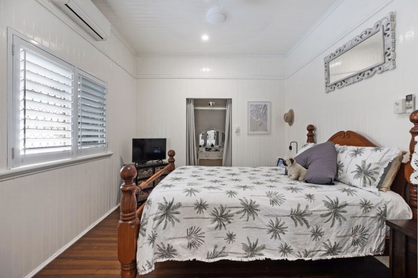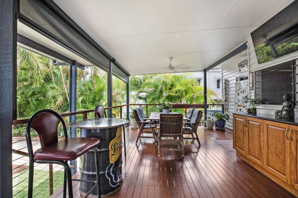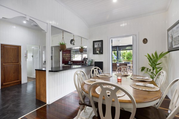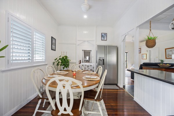 Behind the iconic picket fence, you'll find a double staircase leading to a timber deck that catches the breeze. Inside, original timber floors and tongue-and-groove walls exude warmth and character. The open-plan kitchen and dining area extend to a generous rear verandah, perfect for entertaining or unwinding while overlooking the tropical pool oasis.