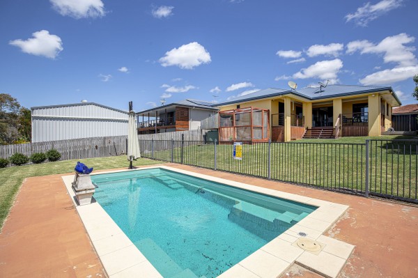 The deck also looks over the large backyard and pool area, which features the stylish inground pool and an enclosed grassy area - perfect for a few poolside sun lounges.
