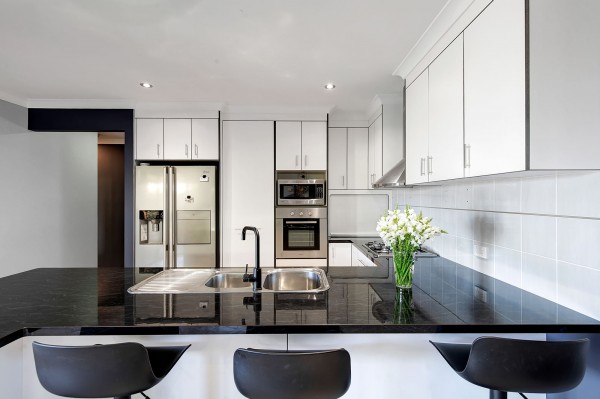 - Elegant kitchen with breakfast bar, dishwasher, double sink and gas stove