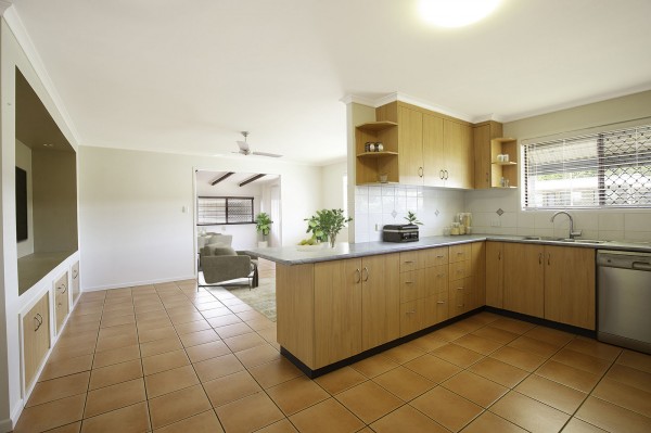 - Kitchen overlooks the large living and dining areas, which flow out through sliding doors to the covered outdoor entertainment area