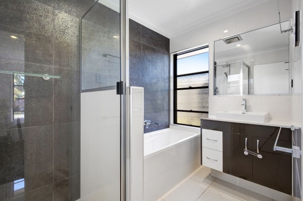 - Main bathroom with floor to ceiling tiles, large vanity and separate shower and bath