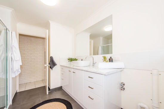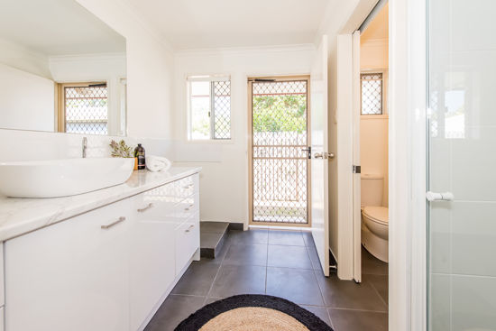 The freshly renovated bathroom is tastefully completed with an easy-access shower, plenty of storage and room to move.