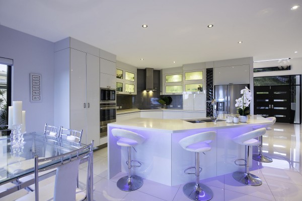 - Chic kitchen with stone benchtop island bench, double sink, dishwasher and display cabinets, overlooking large lounge and dining areas