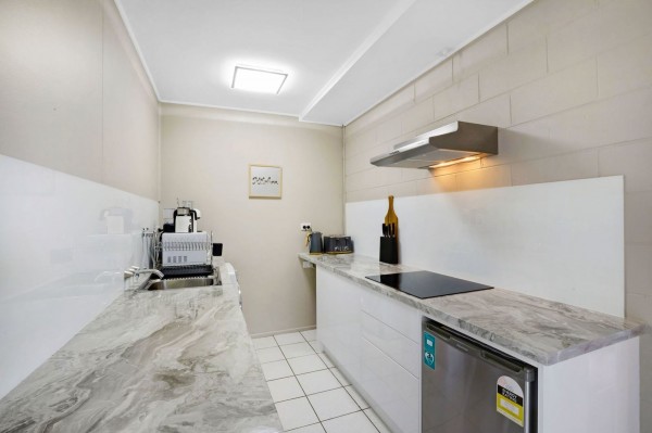 - Stylish near new kitchenette with electric cooktop and dishwasher also incorporates space for laundry