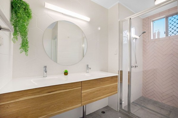 - Incredible renovated bathroom soft colour tones and floor-to-ceiling tiles