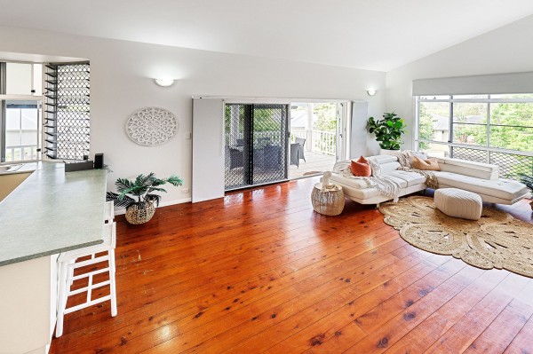 - Open plan living, dining and kitchen area with large windows allowing natural light to flow through the space