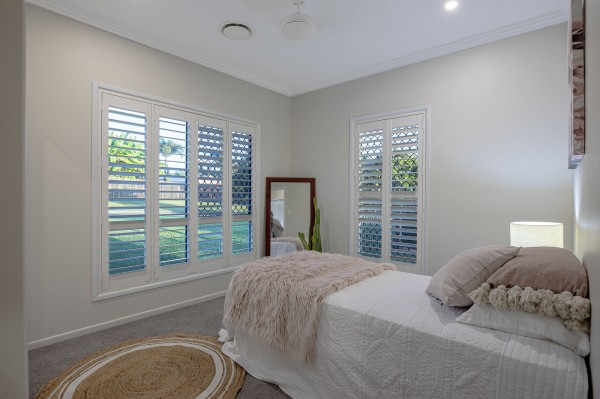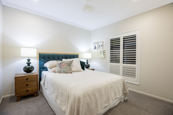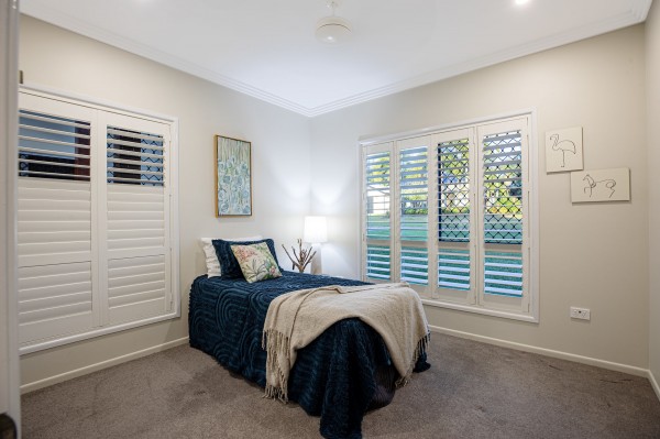 - three generously sized secondary bedrooms, each with built-in wardrobes, carpet, and plantation blinds