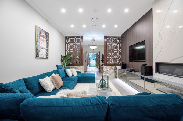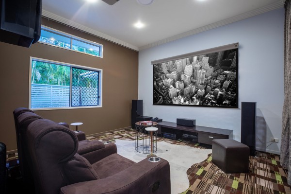 The property features multiple living areas, including a formal living room and a theatre room equipped surround sound, offering a perfect environment for movie nights or relaxing evenings at home.