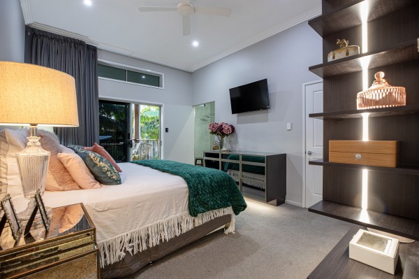 Escape to the sanctuary of the main bedroom, complete with a separate balcony providing stunning views. The ensuite bathroom is a haven of luxury, featuring pendant lighting, double basins, a double shower, and floor-to-ceiling tiles. The walk-in robe with built-in mirror vanity provides ample storage space for all your belongings.