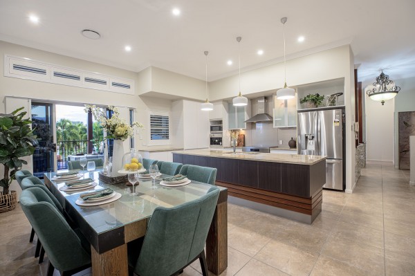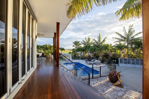 The kitchen is a chef's dream, boasting stone benchtops, double sinks, and top-of-the-line appliances, including an induction cooktop and a built-in coffee machine. The adjacent dining area connects to the wrap-around timber deck, where you can enjoy alfresco dining while overlooking the massive pool and the picturesque countryside.
