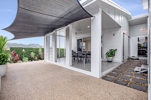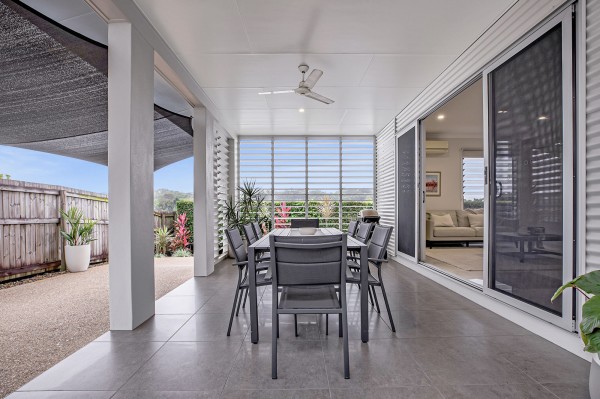 - The outdoor covered entertainment area, adorned with white plantation shutters and a BBQ space, promises delightful gatherings