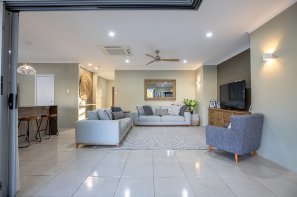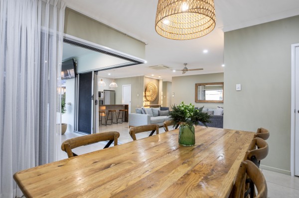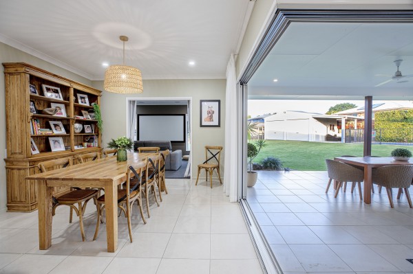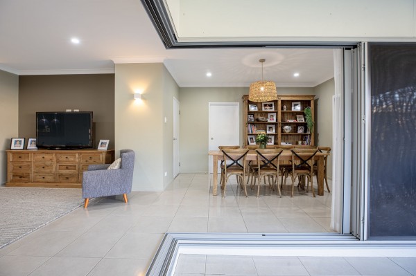 - An open-concept dining and living area with bi-fold screens that seamlessly connect to the patio