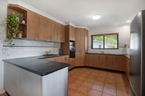- Spacious corner kitchen with gas cooktop, stainless steal range hood, oven, an abundance of benchtop space and storage
