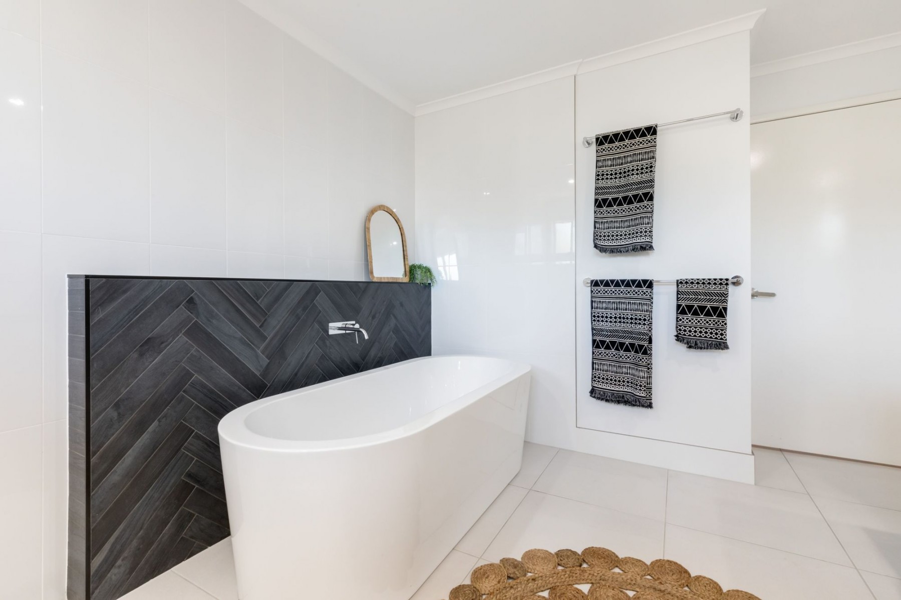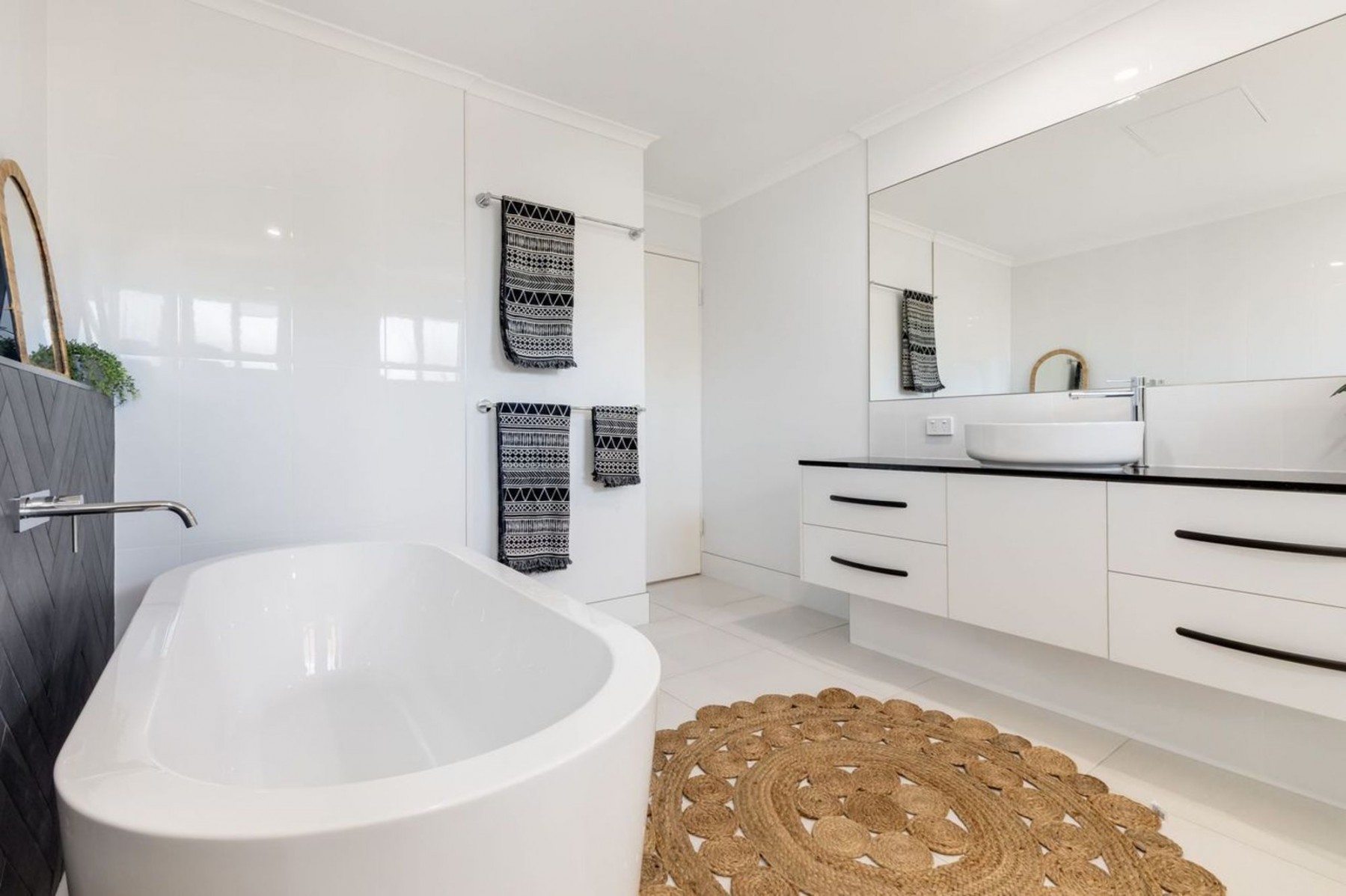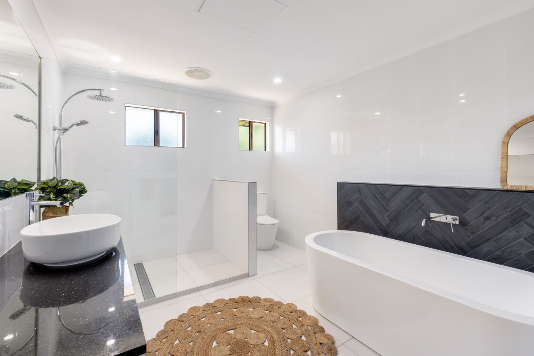 - Main bathroom is as good as you will see, featuring incredible colors, stone benches, herringbone tiling, rain shower and a luxurious free-standing tub.