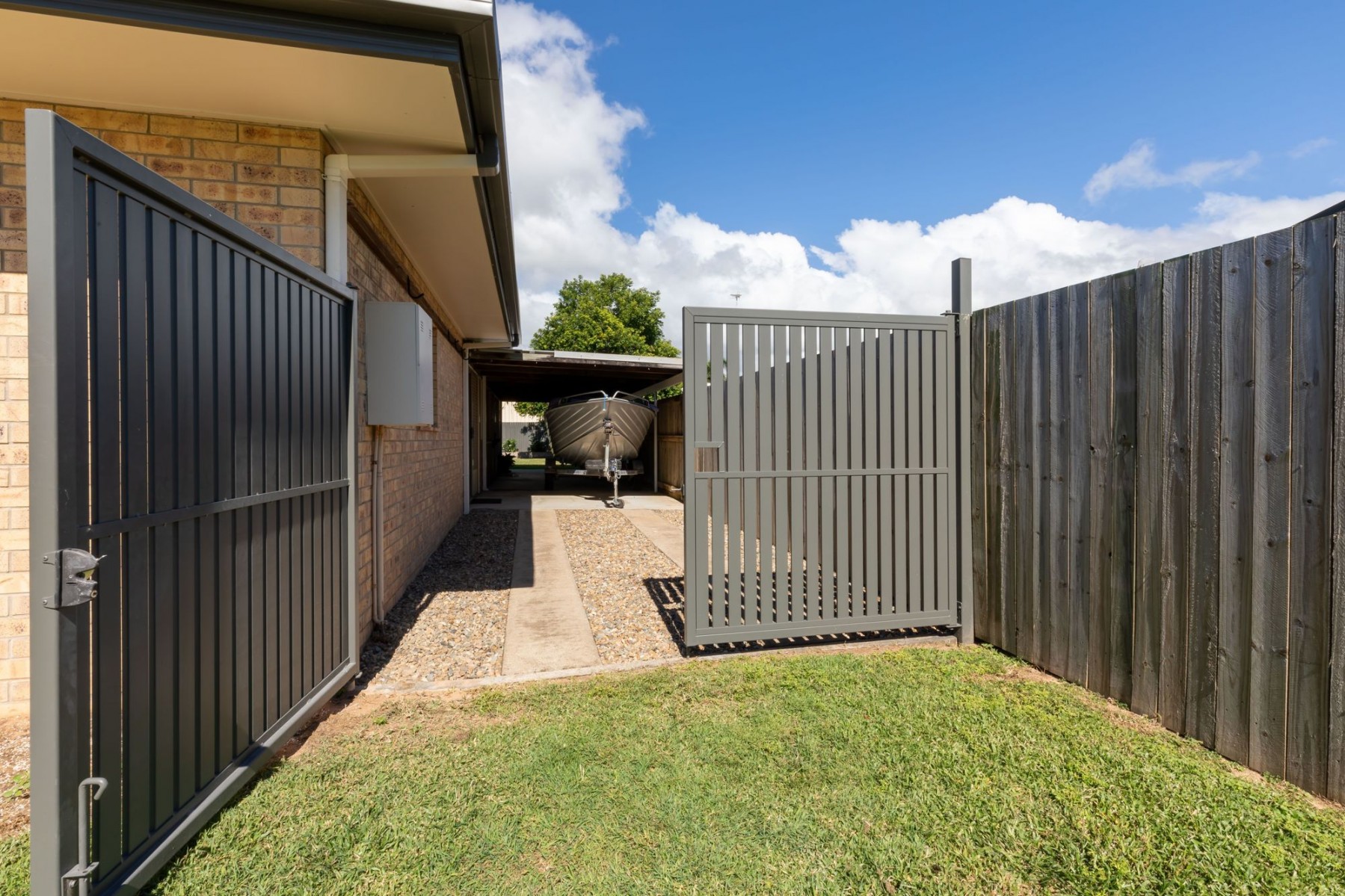 - Outside there is a lean-to structure that easily covers a small boat or campervan and provides side access to the backyard.