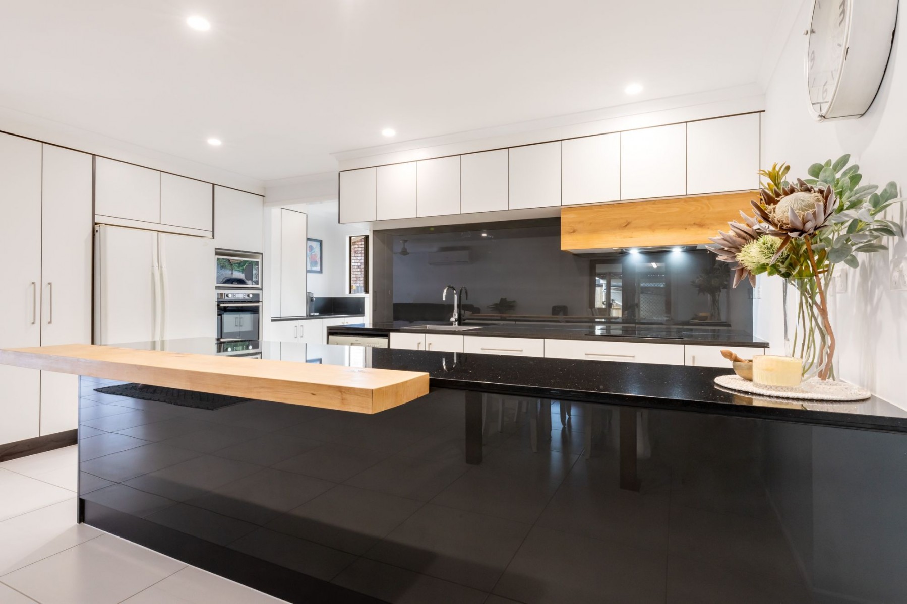 - Kitchen is of the best standard with no expense spared and includes huge granite bench tops with the addition of timber. Classy lighting, top of the range tap fittings and appliances complete the show stopping kitchen.