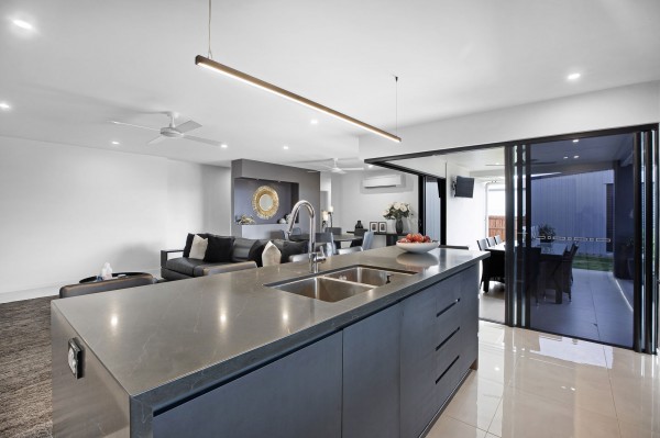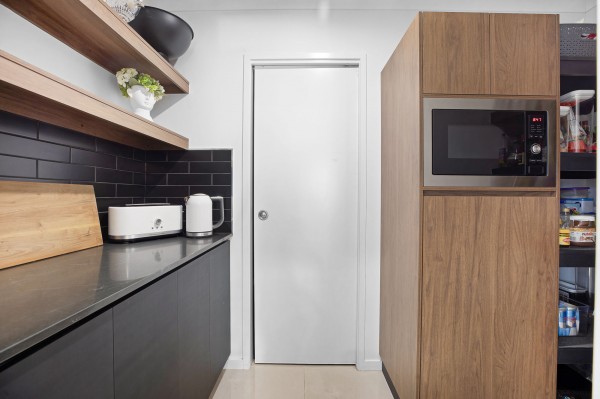 - Designer kitchen with stone benchtops, a gas cooktop, a kitchen window, an integrated fridge, pendant lighting and a large walk-in pantry with direct access from the garage