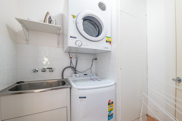 • Laundry equipment: washing machine, dryer, and ironing board.