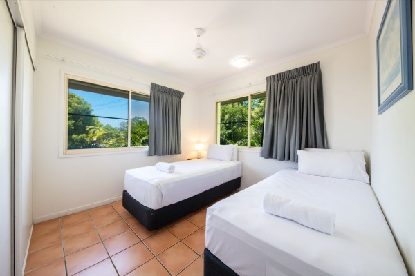 • Bedroom 3 has built-ins, ceiling fan, and two single beds.