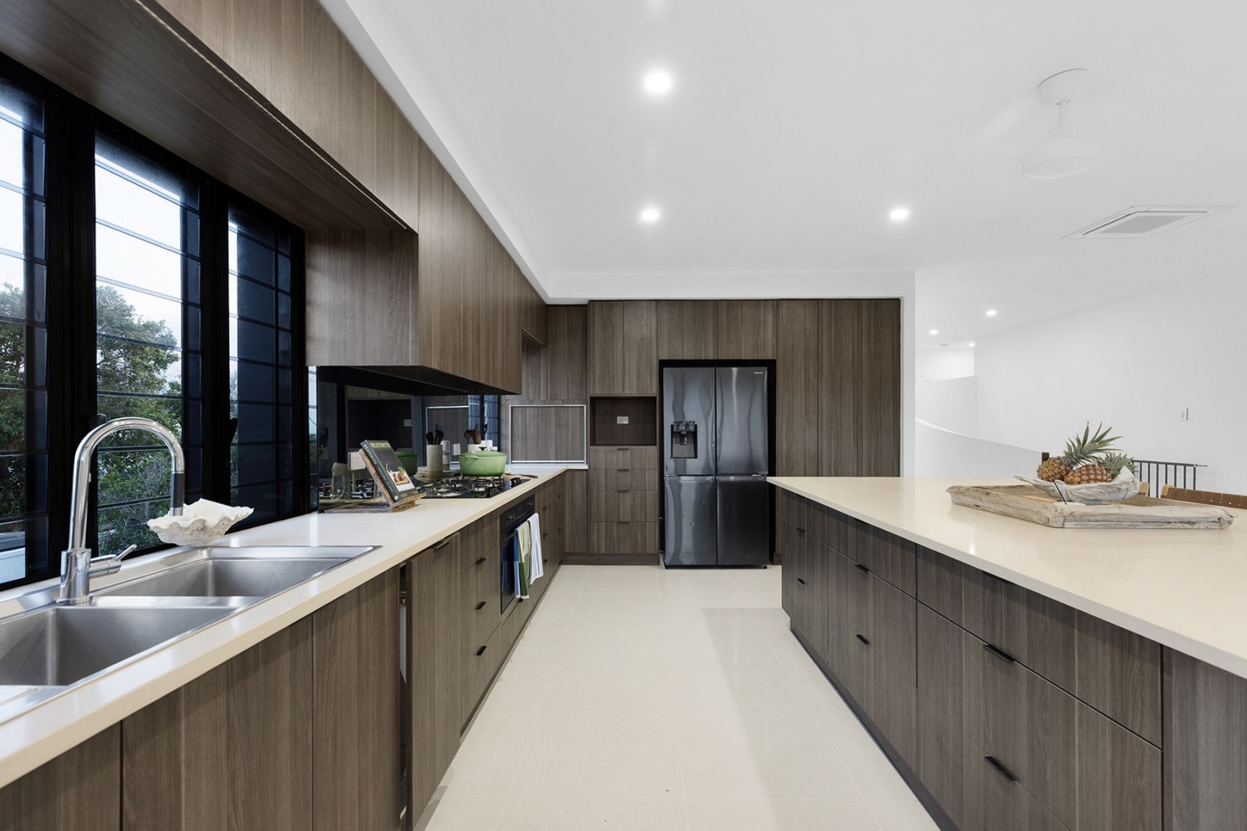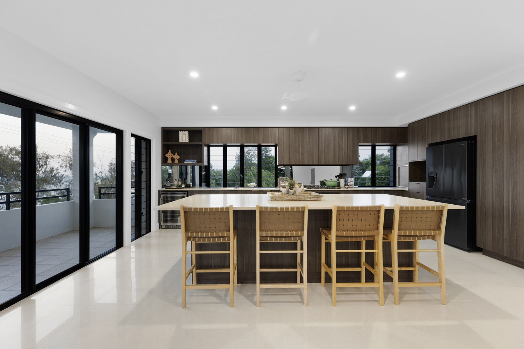 - Designer kitchen with large stone island bench, timber laminate cabinetry, gas cooktop, ample storage and louvred windows framing the ocean outlook