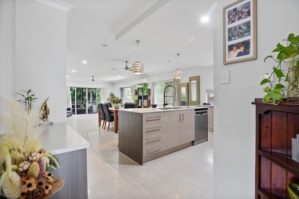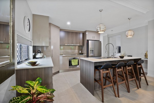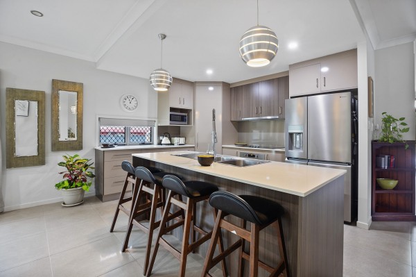 - A beautifully appointed kitchen with premium 2-pac cabinetry, stone benchtops, and a large island bench with statement pendant lighting.