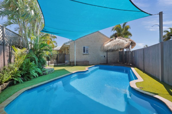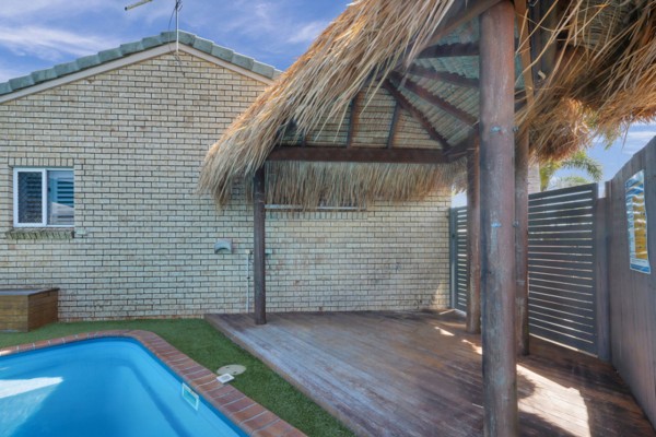- Resort-style pool with a Balinese hut, decking & tropical landscaping
