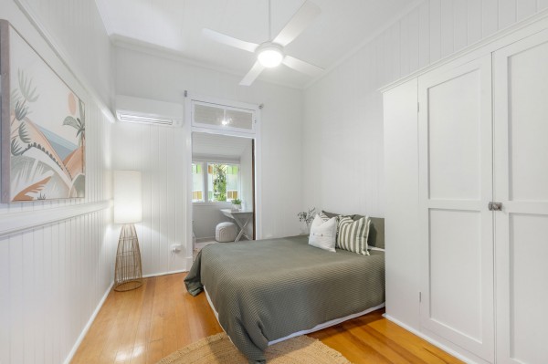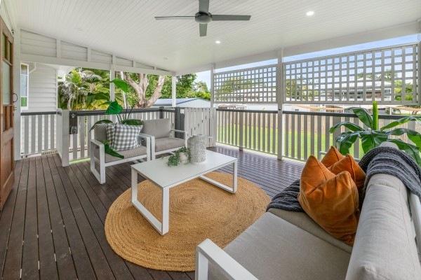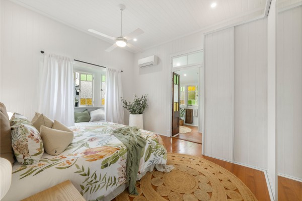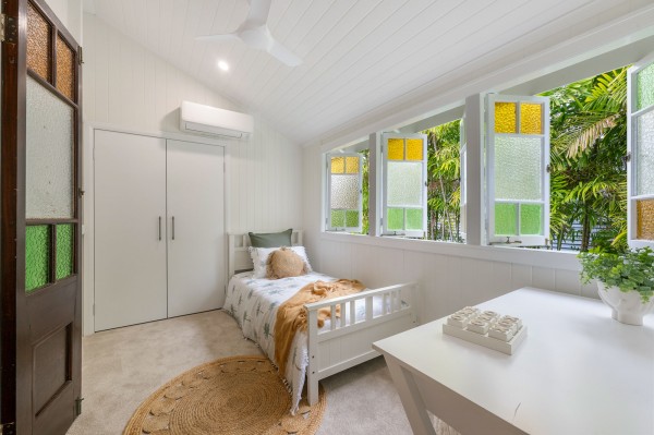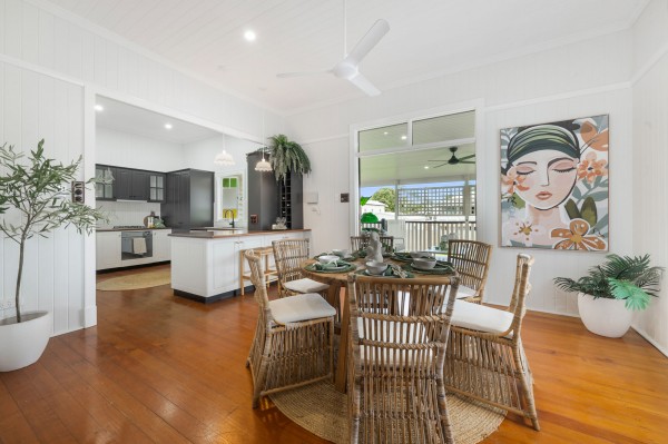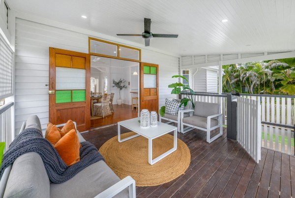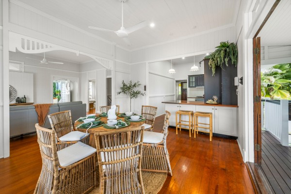 Experience the timeless charm of Queensland living with light-filled interiors and open, flowing spaces. French doors seamlessly link the living areas to inviting verandas, while casement windows welcome in cool breezes. Elegant fretwork add character throughout, beautifully paired with classic tongue and groove walls, polished timber floors, and vibrant stained glass accents.