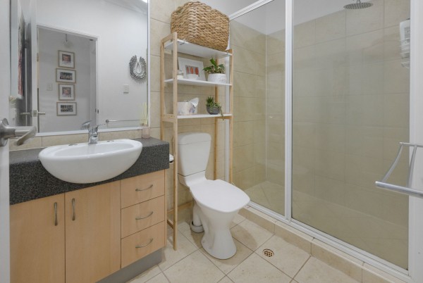 •	Light filled bathroom with a large shower