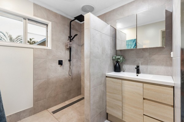 - Stylishly renovated bathroom with floor-to-ceiling tiling, walk-in shower plus seperate toilet